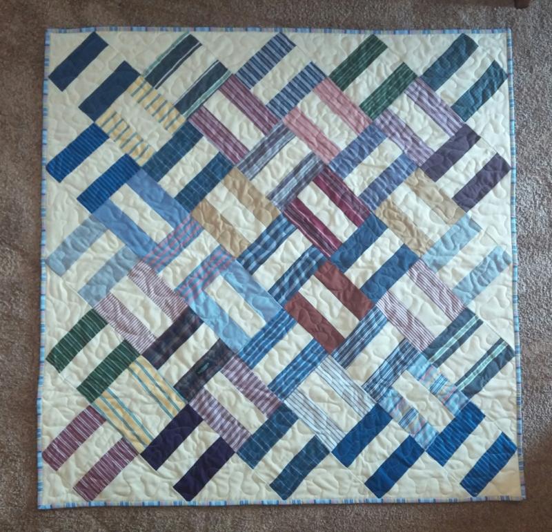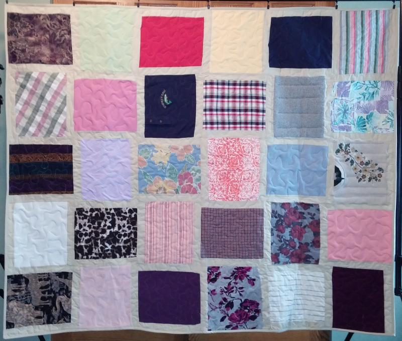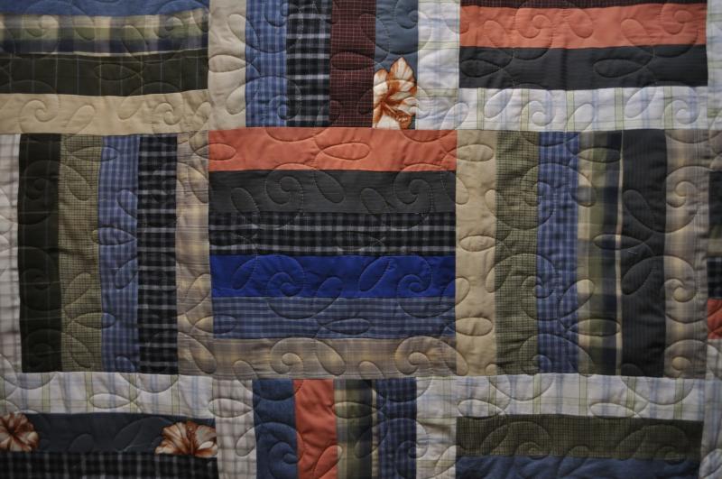 The best items for quilting are woven cottons and cotton blends, like button down, oxford type shirts and twill, khaki type pants, or jeans... generally anything that’s not stretchy. Knit fabrics can also be used, like t-shirts & golf shirts, but generally require a stabilizer (interfacing) to avoid stretching or distortion. This changes the options for quilting patterns and adds to the time and expense of making a quilt. Even satins, silks, rayons, and other dressy fabrics can be stabilized and made into a quilt, but anything delicate that requires dry cleaning will require that the finished quilt be dry cleaned as well.